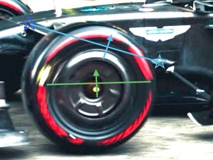The green line is a guesstimate of the lower wishbone pivot line, while the green arrow is its direction of travel as the ride height reduces with speed or under braking or when the car rolls.