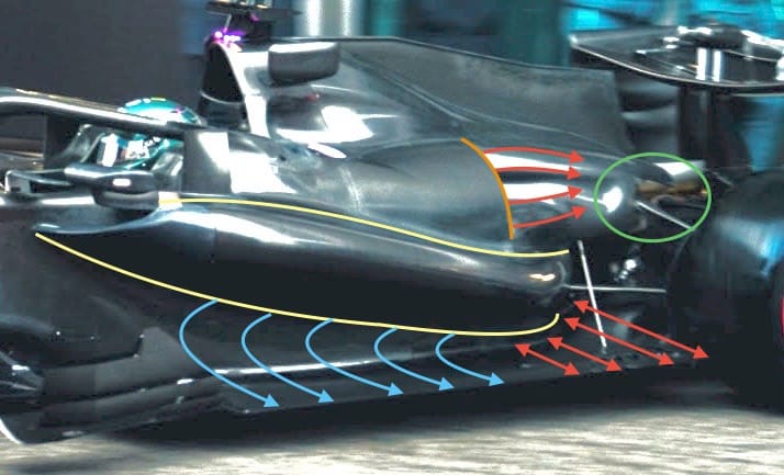 It then opens up abruptly, which is highlighted with the red arrows just where the high pressure in front of the rear tyre needs to be relieved. This abrupt opening will entice that displaced airflow to go inside through what is called the Coke bottle area. Increasing this flow volume reduces tyre drag and improves the performance of the diffuser and rear wing, a win-win situation.