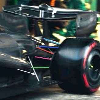 Aston Martin also have the louvres, which are highlighted with the blue ellipse, in the floor section in front of the rear tyre. I can't see them in detail, but I believe they will connect the airflow on top of the floor in that area with what is called the outward tyre squirt. This is the airflow that is displaced when the tyre rotates onto the track surface. Doing it this way will reduce the tyre squirt going inboard.