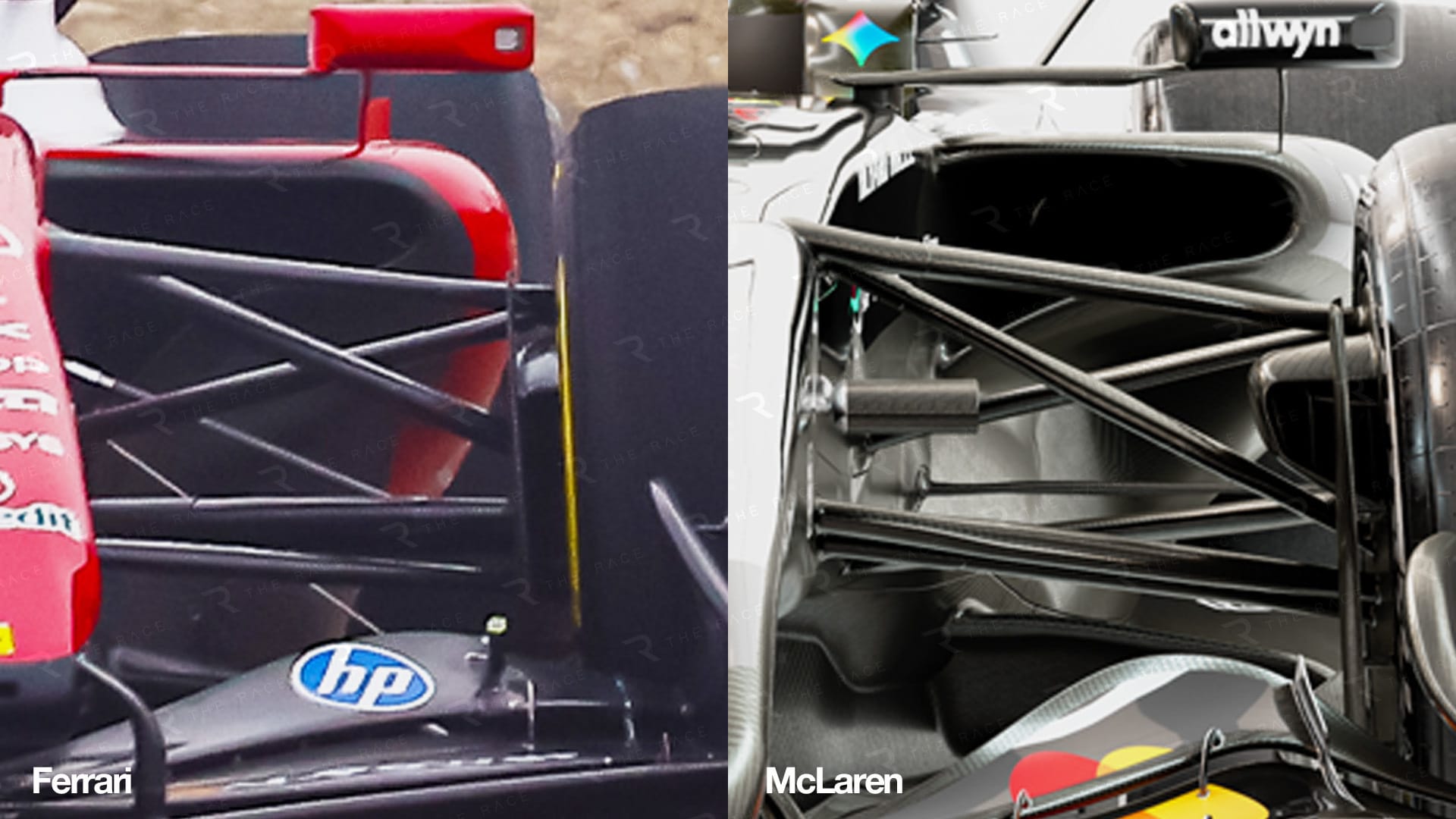 The brake ducts are a little different but both retain the vertical splitter managing the airflow coming off the front tyre. Also the lower wishbone and trackrod layout, which is difficult to see on the McLaren, is a bit different to the others.