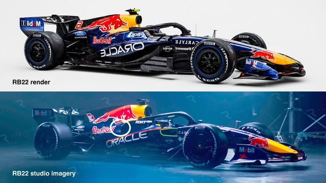 Comparing Red Bull's initial 'concept' renders to the studio shots, we can see a marked difference in the sidepod size and upper surface (red highlight) detail. Could we call this a 'zero sidepod' solution? Well, it's certainly smaller than most, but 'zero'? Not really.