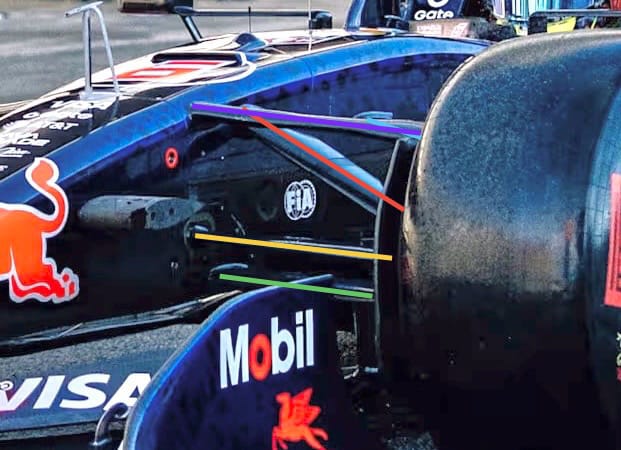 It may be that Red Bull doesn't have a side in the diffuser in that area going rearwards and so is then using the turning vane further outboard (light blue highlight line) to help pull airflow through the diffuser by connecting what we call the 'tyre squirt' airflow that is created by the tyre rotating onto the track surface.