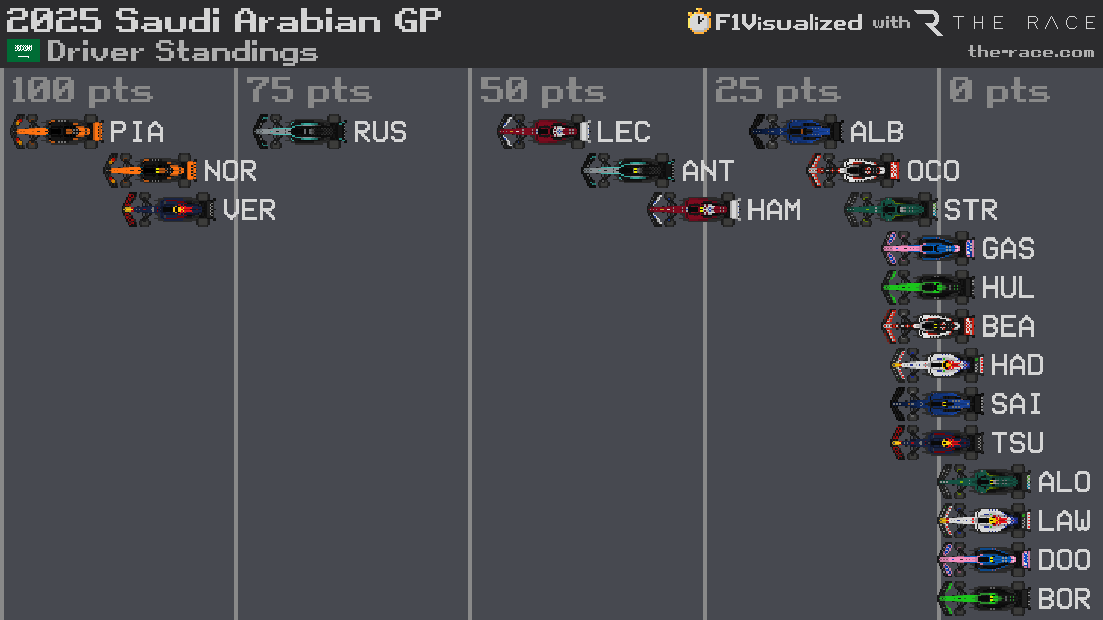 There were no points for Aston Martin, Haas, Sauber or Alpine.